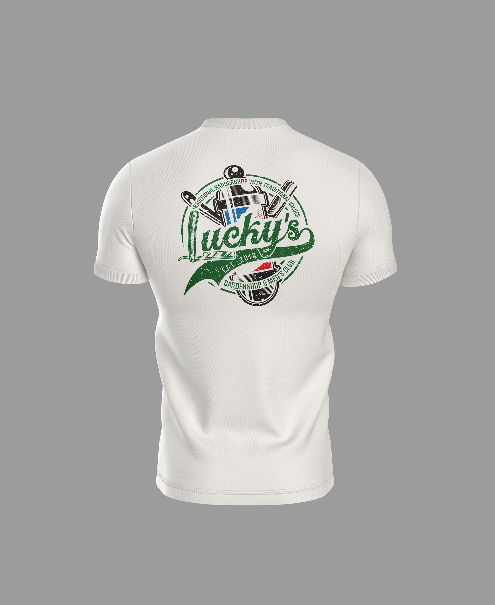 - Lucky's razor logo upper left chest. Lucky's full-color shop logo on back