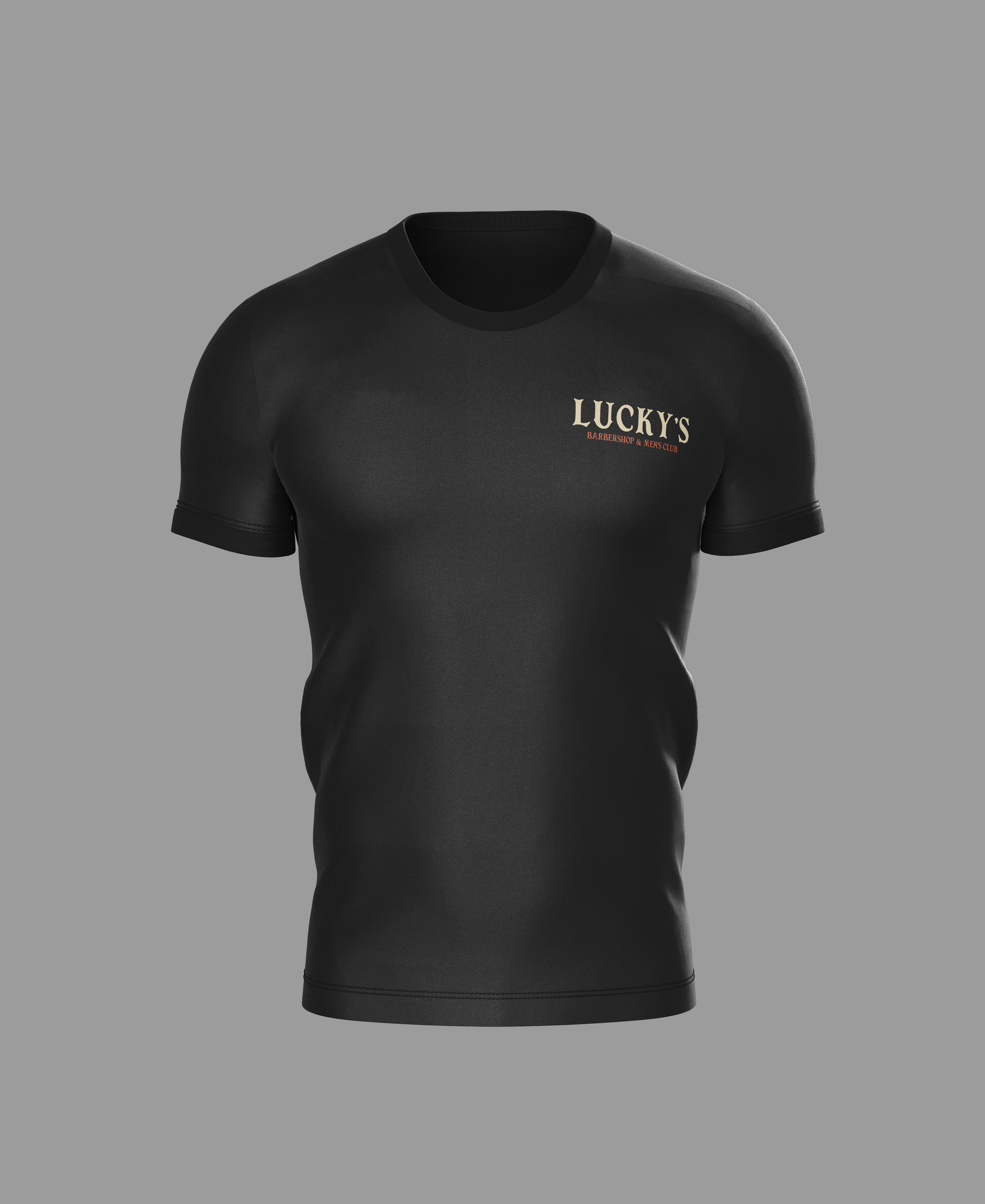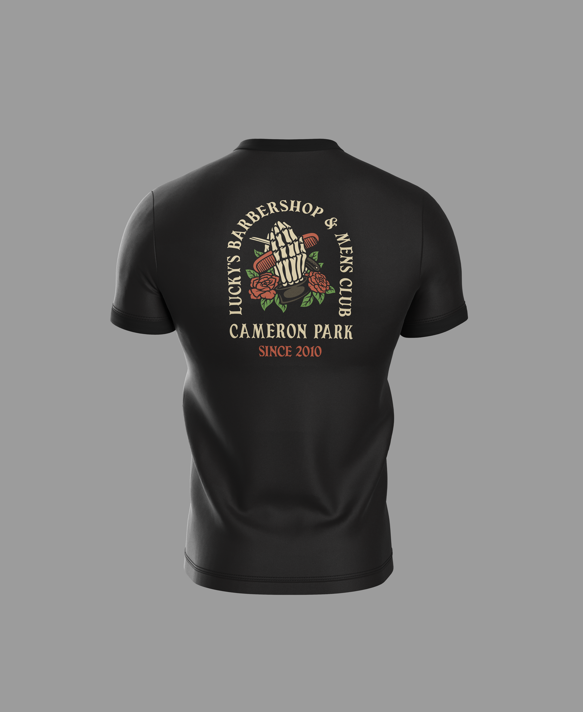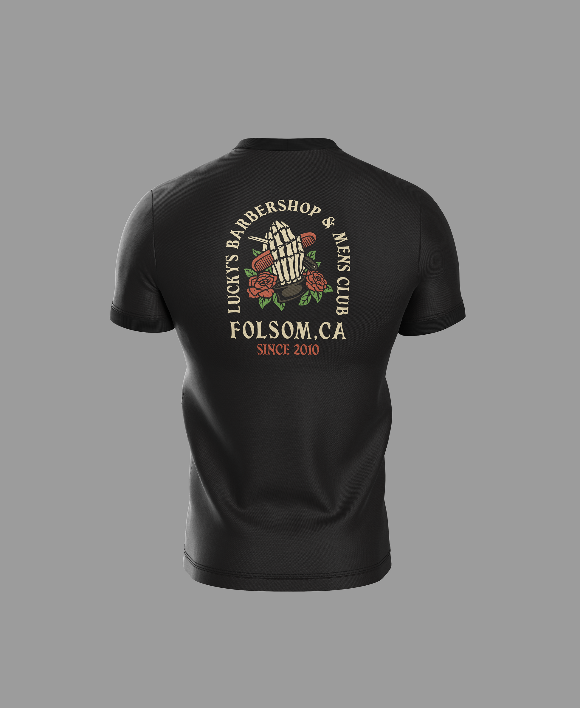 - Lucky's tattoo-inspired graphic tee, with hand-drawn praying hands graphic on back